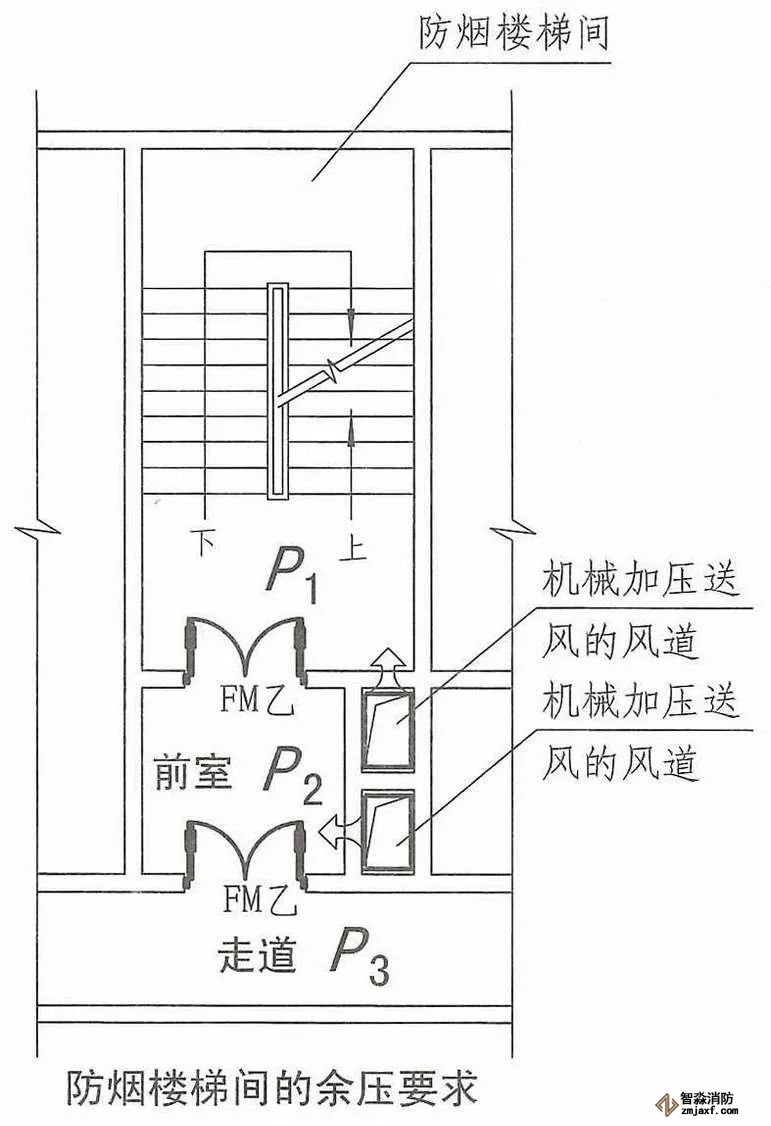 2.樓梯間與走道之間的余壓差應(yīng)為40Pa?50Pa;