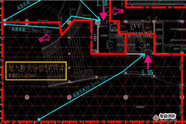 經(jīng)過(guò)和設(shè)計(jì)單位仔細(xì)探究,確定當(dāng)一個(gè)防火分區(qū)僅有 1 部剪刀樓梯作為安全出口的時(shí)候,需要滿足疏散距離不超過(guò) 10 m 的要求,現(xiàn)防火分區(qū)圖中,每一個(gè)防火分區(qū)都不止 1 部剪刀樓梯作為安全出口,因此原平面滿足《建規(guī)》第 5. 5. 17 條的規(guī)定。