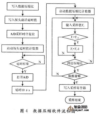 數(shù)據(jù)壓縮處理是對射頻信號高速采樣后進(jìn)行前置處理的重要環(huán)節(jié)之一,需要在保持超聲回波信號基本特征前提下對采樣數(shù)據(jù)進(jìn)行在線壓縮,而且要求壓縮后的數(shù)據(jù)與原始采樣信號的包絡(luò)相吻合。為此,在每次壓縮過程中,只取采樣所得的最大值,而舍棄其他采樣值。FPGA將計算所得采樣數(shù)據(jù)的壓縮比、探頭前沿延時計數(shù)值等數(shù)據(jù)送入相應(yīng)的鎖存器,然后發(fā)出時序復(fù)位命令并發(fā)射,啟動探頭延時計數(shù),延時到后啟動A/D采樣,同時壓縮比計數(shù)器開始計數(shù),在時鐘信號的控制下,每采樣一次,壓縮比計數(shù)器減1,并將當(dāng)前采樣值與前次采樣值比較,如大于則保存,否則舍棄,直至壓縮比計數(shù)到零后,得到一個有效的采樣數(shù)據(jù)。同時壓縮比計數(shù)器自動復(fù)位,重新開始計數(shù),其工作流程如圖4所示。