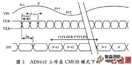 AD9446芯片的控制時序與傳統(tǒng)的低速A/D有所不同,它完全依靠時鐘來控制其采樣、轉(zhuǎn)換和數(shù)據(jù)輸出。AD9446通常在CLK第一個時鐘的上升沿開始采樣轉(zhuǎn)換,并在經(jīng)過延遲tpd后,開始輸出數(shù)據(jù)。而數(shù)據(jù)則在第13個時鐘到來時才出現(xiàn)在D15~D0端口上。圖3是AD9446工作在CMOS模式下的時序圖。