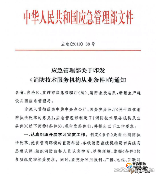 為深入貫徹落實(shí)中共中央辦公廳、國(guó)務(wù)院辦公廳《關(guān)于深化消防執(zhí)法改革的意見》,應(yīng)急管理部制定了《消防技術(shù)服務(wù)機(jī)構(gòu)從業(yè)條件》(以下簡(jiǎn)稱《條件》),現(xiàn)印發(fā)給你們,并提出以下工作要求: