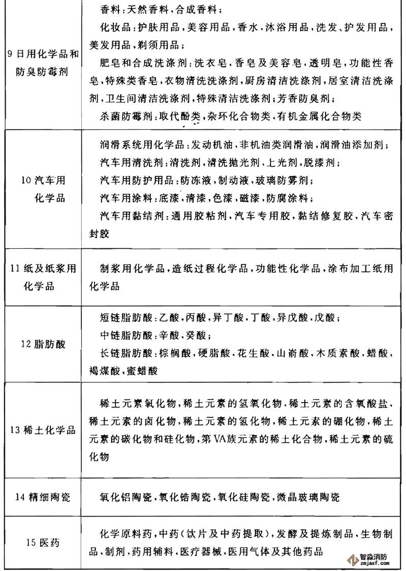關(guān)于精細(xì)化工產(chǎn)品分類,上海市工程建設(shè)規(guī)范《精細(xì)化工企業(yè)設(shè)計防火規(guī)范》DGJ 08-2133將精細(xì)化工產(chǎn)品分為十五大類:農(nóng)藥、染料、涂料(包括油漆和油墨)、顏料、試劑和高純物、信息用化學(xué)品(包括感光材料、磁性材料等能接受電磁波的化學(xué)品)、食品和飼料添加劑、黏合劑、催化劑和各種助劑、化學(xué)藥品(原料藥)和日用化學(xué)品、高分子聚合物中的功能高分子材料(包括功能膜、偏光材料等)、微電子化學(xué)品、生物化工制品(生物技術(shù)藥物、診斷試劑、化學(xué)藥物)、太陽能光伏光熱化學(xué)品、新材料(高性能膜材料、特種玻璃、功能陶瓷)等。